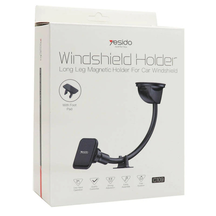 هولدر مدل C109 از Yesido با بدنه متشکل از پلاستیک سخت و سیلیکون ضمن مقاومت مطلوب در برابر فشار و ضربه، توسط یک پایه مکنده بر روی داشبورد، شیشه ماشین و سایر سطوح صاف محکم و بدون لغزش متصل می شود. با بهره گیری از آهنربای قوی C-109 به صورت مگنتی به گوشی موبایل و دیگر دستگاه ها متصل شده و در برابر بروز تکان های شدید، لرزش و … دستگاه را ثابت نگه می دارد. همچنین با امکان چرخش 360 درجه ای که برای سری هولدر در نظر گرفته شده انتخاب و تنظیم بهترین زاویه مناسب کاربر را برای دید بهتر صفحه نمایش در حین رانندگی فراهم می کند. حداکثر طول بازو هولدر معادل 30 سانتی متر است که از قابلیت انعطاف پذیری و خم شدن برای دسترسی مناسب و استفاده راحت تر برخوردار می باشد. این بازو در برابر سنگینی و وزن موبایل نیز دارای تحمل پذیری مناسبی بوده و توسط یک نگهدارنده چسبی از تکان خوردن گوشی جلوگیری می کند.